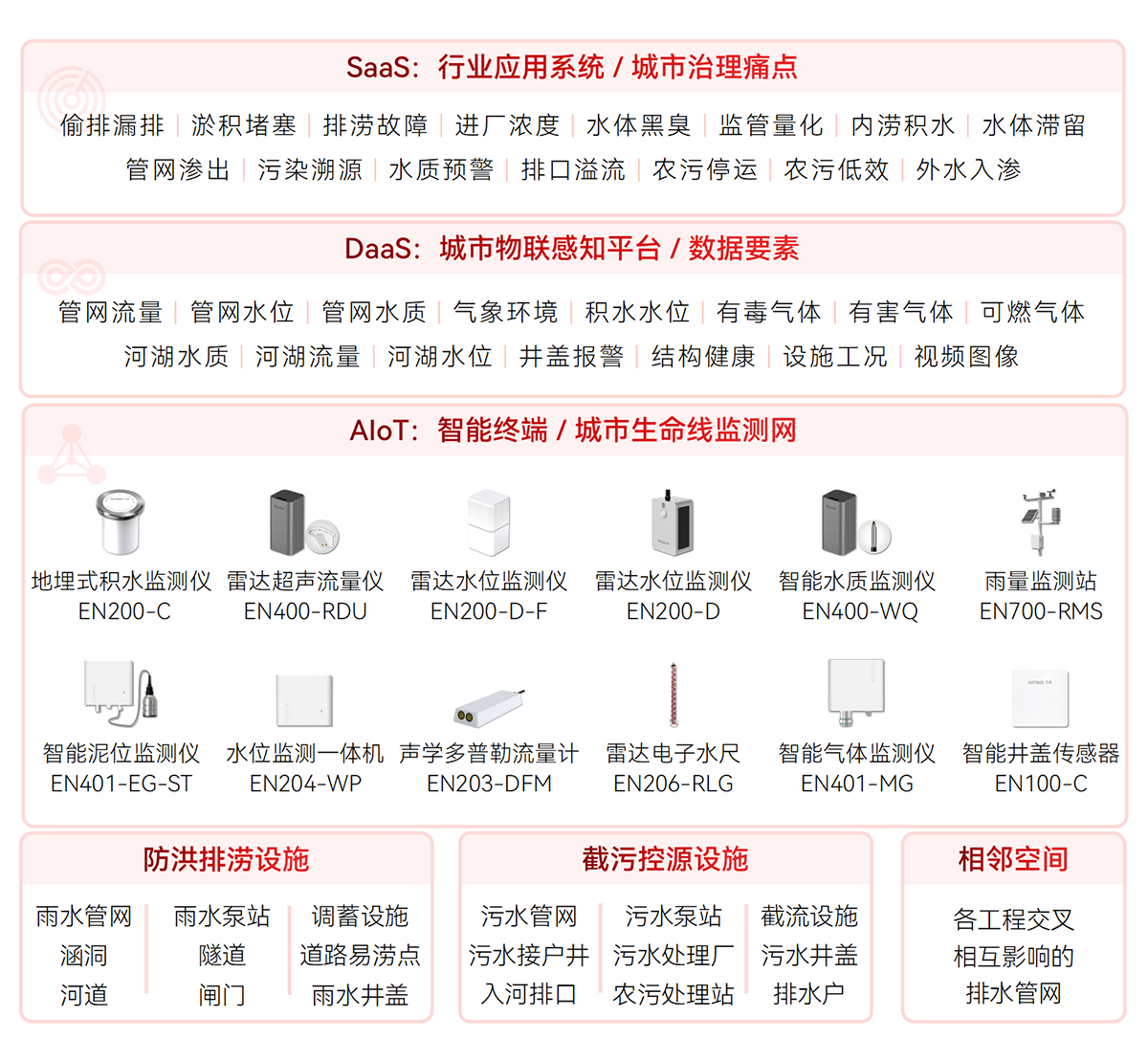 對排水設施(雨污水管網、窨井蓋、截流泵站、提升泵站、抽水泵站、農村污水處理站、溢流井、排水井、污水處理廠、調蓄設施等)關鍵節點、易澇積水點,河湖水位、流速,管網液位、流速、水質,內澇積水等指標進行實時數據監測,形成設施完整、拓撲清晰、位置準確的排水設施“一張圖”,為排水空間規劃、設計、排水設施改造提供決策支持。